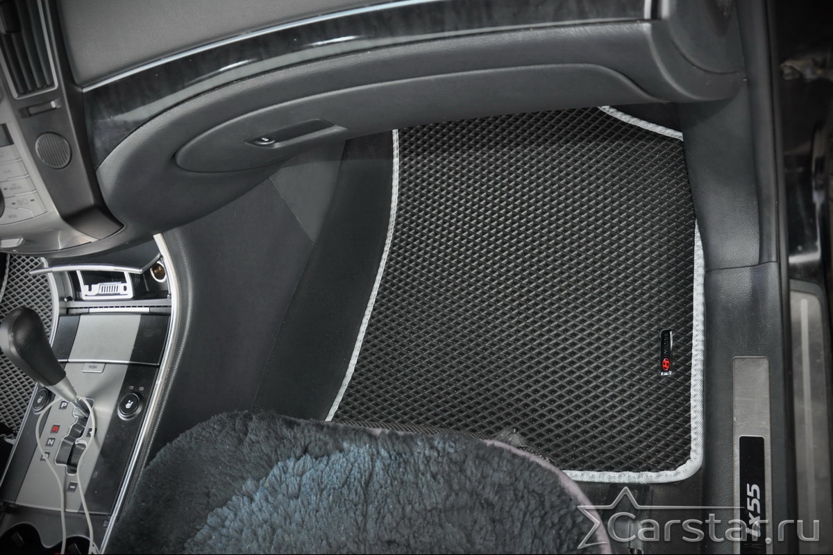 Толщина ковриков EVA составляет 10-12 мм. Глубина ячеек 7-8 мм. Такая толщина ковриков позволяет им служить довольно долго, не протираясь до 3 лет. А благодаря такой глубине ячеек коврик EVA площадью 1 кв.м. способен захватить около 3,5 л жидкости, сохраняя в чистоте вашу обувь и обивку салона.